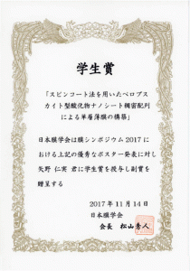 修士課程1年の矢野仁実さんが日本膜学会・膜シンポジウム2017で学生賞を受賞しました。 【受賞内容】層状ペロブスカイト構造を有する複合酸化物からソフト化学手法により創出したペロブスカイト型酸化物ナノシートについて、分散溶 […]