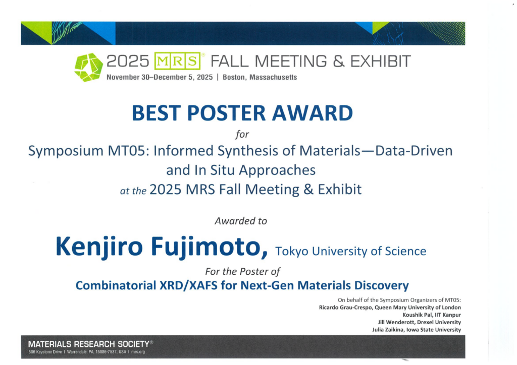 内容:Materials Research Societyが主催する国際会議「2025 MRS Fall Meeting & Exhibit」に設置されたシンポジウム「Symposium MT05-Informed Synthesis of Materials-Data-Driven and In Situ Approaches」において、多元系材料探索におけるデータ駆動型アプローチと高スループット実験を統合した基盤構築の一つとして、既開発の自動合成と高速物性評価に加え、1日60〜80試料の結晶学的解析を実現することを目標とした放射光XRD/XAFS計測と自動構造精密化に関する研究を発表したところ、「Best Poster Award」として表彰された。